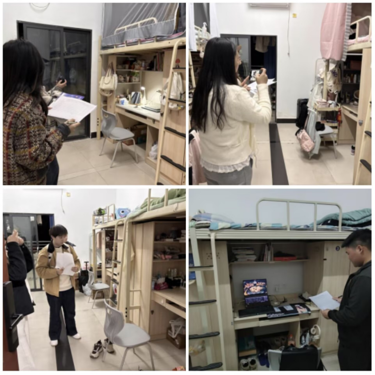 本次查寝以《党员示范床位标准细则》为依据,围绕六大核心维度开展:桌面整洁方面,要求常用物品分类摆放、无闲置杂物、电线收纳规范;床铺规范上,床帘需完全拉开、被子叠放整齐、床单无褶皱及非睡眠用品堆积;同时涵盖个人杂物集中收纳、垃圾桶及时清理无异味、个人区域地板干净畅通、无违规用电及违禁物品等安全合规要求。查寝工作由党员骨干与发展对象组成的2人小组负责,于3月内随机选定1日开展检查,工作人员佩戴党徽或者团徽现场打分,对问题项拍照存档并当场反馈整改建议,确保检查结果客观公正。