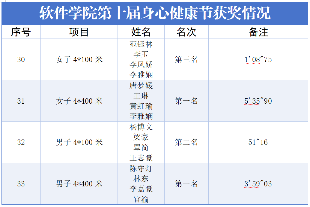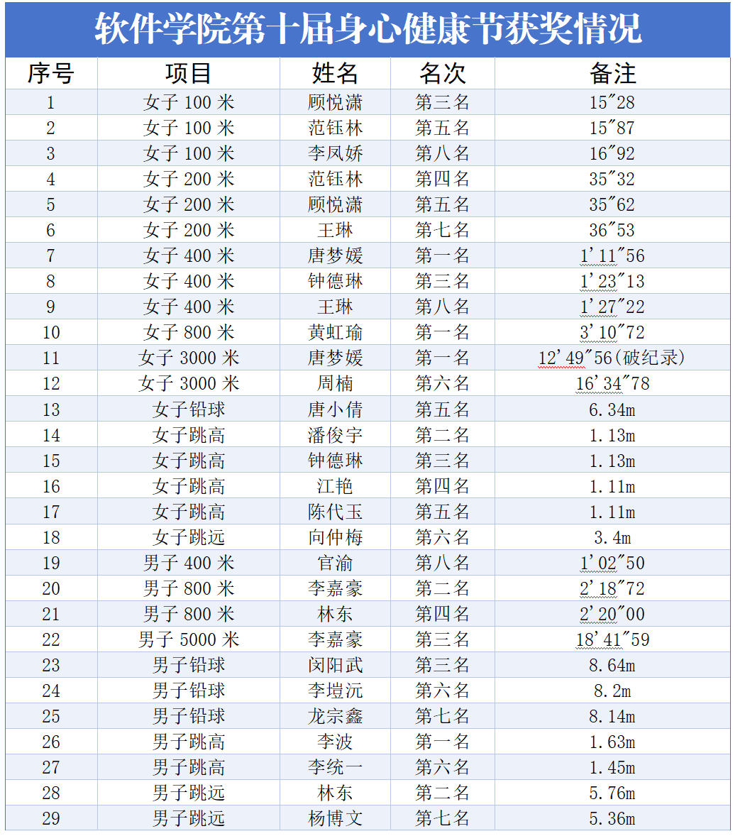 重庆工程学院于2026年4月9日至10日在足球场举行第十届身心健康节,在为期两天的激烈角逐中,全院师生积极参与、奋勇争先,以206分的成绩位居二级学院第一(学生),充分展现了软件学子昂扬向上的精神风貌和顽强拼搏的体育精神。经裁判组公正评判、组委会审核,现将各项获奖情况通报如下: