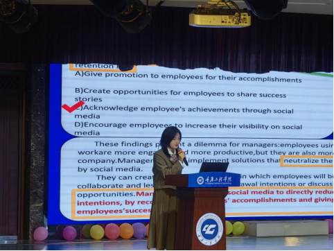 本次讲座的主讲人是软件与人工智能学院辅导员杨双溢,外语教学部专任教师冉维筠,软件与人工智能学院辅导员罗文涛,管理学院辅导员兼外语老师莘越和4位学生代表。主讲人们详细介绍了英语写作思路和构思方法,许多万能词汇和高级技巧和四级英语听力锦囊,四级英语考试中的注意事项,强调了英语四级听力的方法和英语在寻找工作中的重要性。