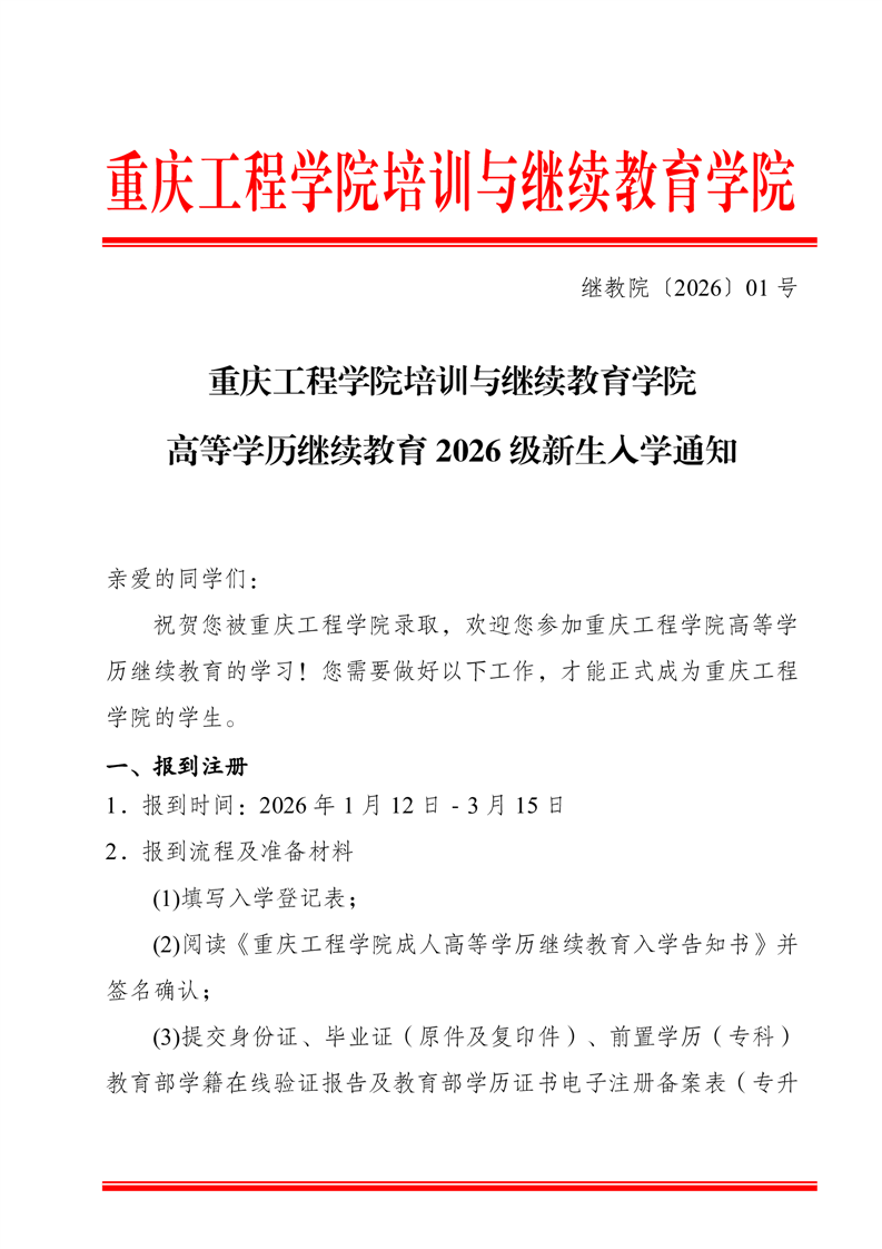 高等学历继续教育2026级新生入学通知