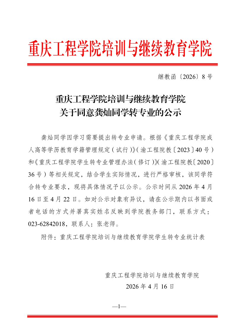 重庆工程学院培训与继续教育学院关于同意龚灿同学转专业的公示