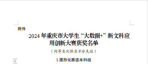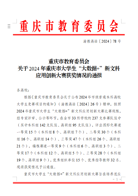 我院学生邓明月、郭彤、 卢星宇(指导教师:徐恺、赵鹏飞)参加2024年重庆市大学生“大数据+”新文科应用创新大赛荣获图形化赛道本科组三等奖。