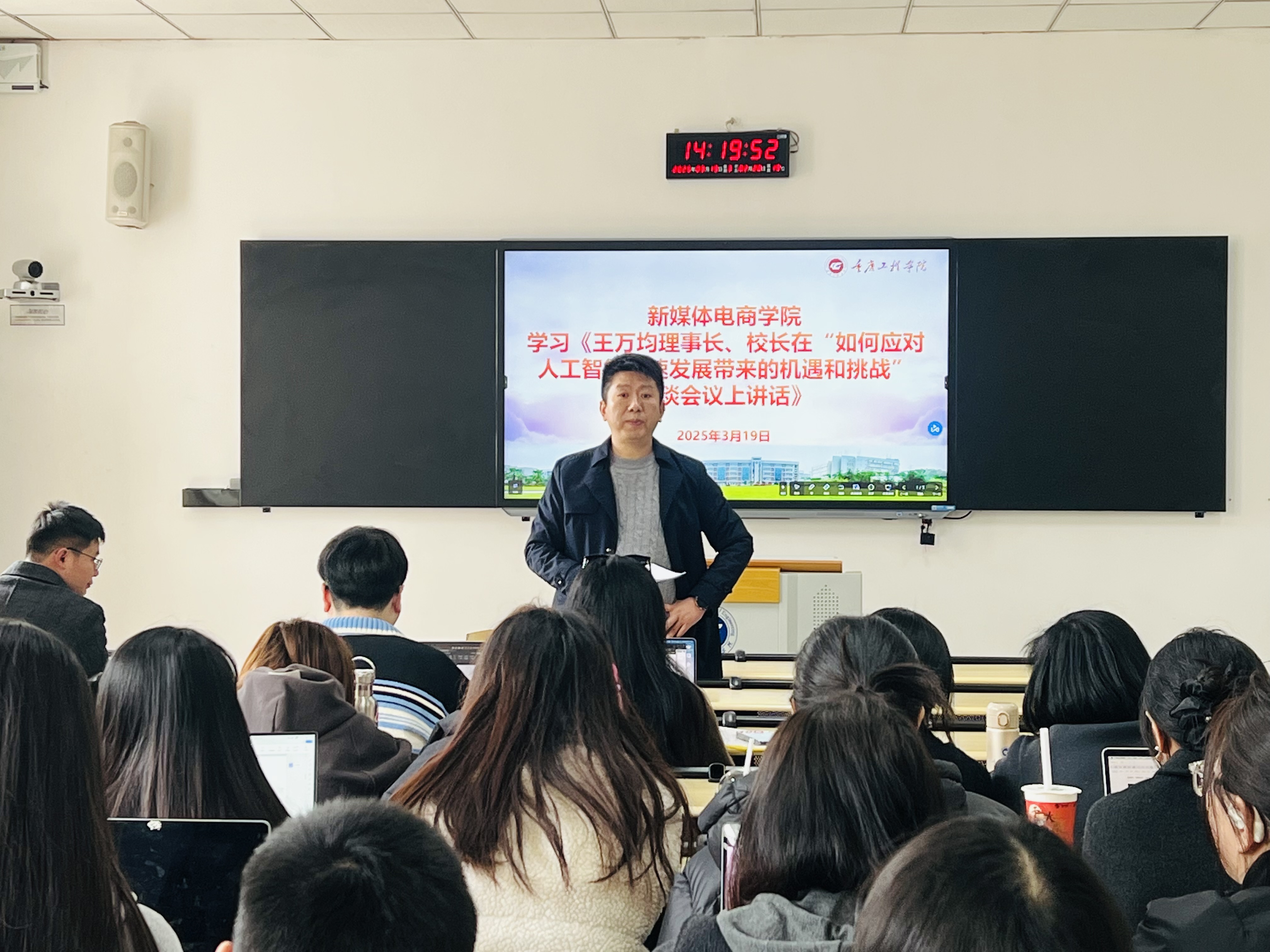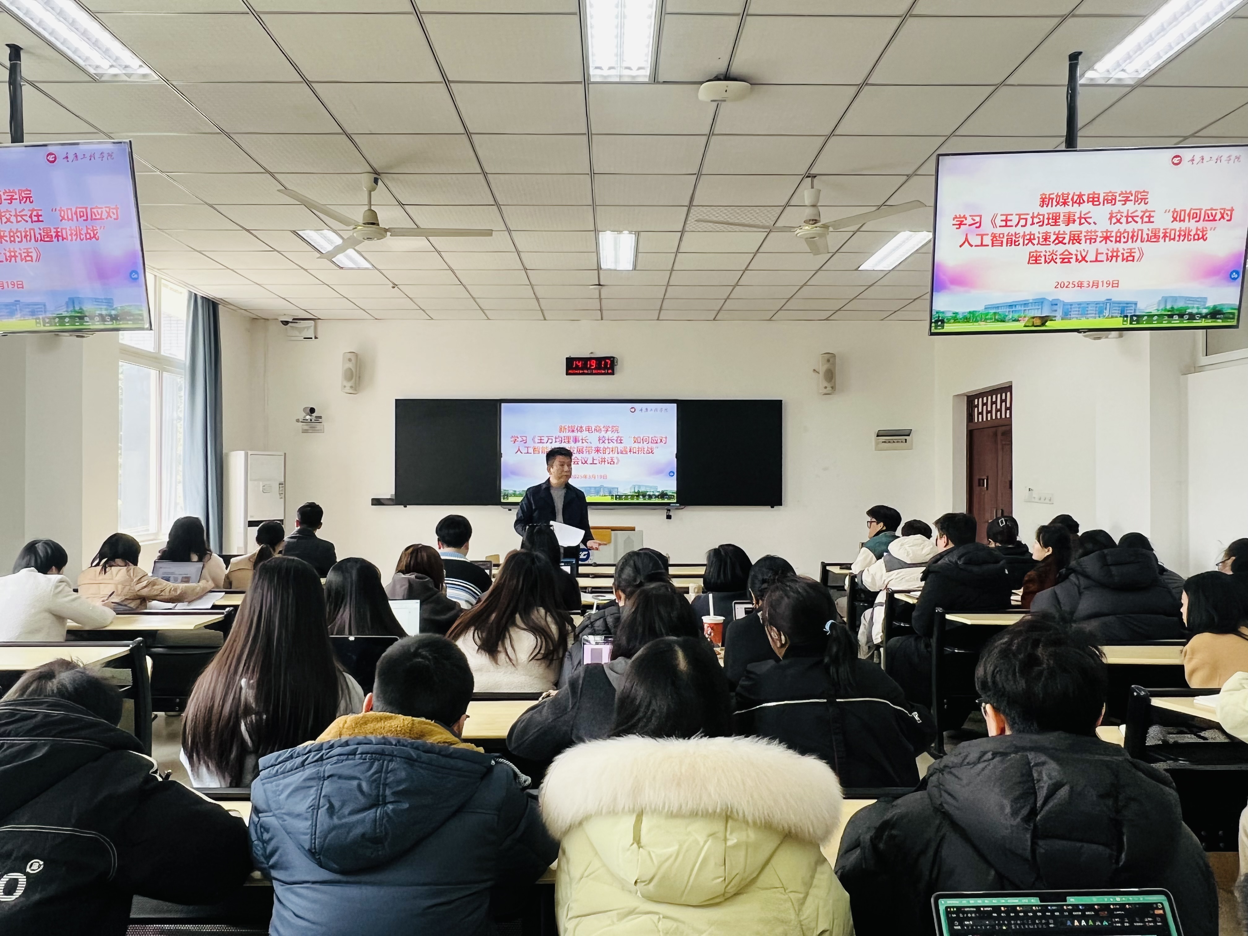 本网讯(图/文:吴孝平)为深入落实学校人工智能发展战略,3月19日,新媒体电商学院在6教115组织全体教职工开展专题学习活动,认真学习王万均理事长、校长在“如何应对人工智能快速发展带来的机遇和挑战”座谈会上的讲话要求,会议由新媒体电商学院院长邹均主持。