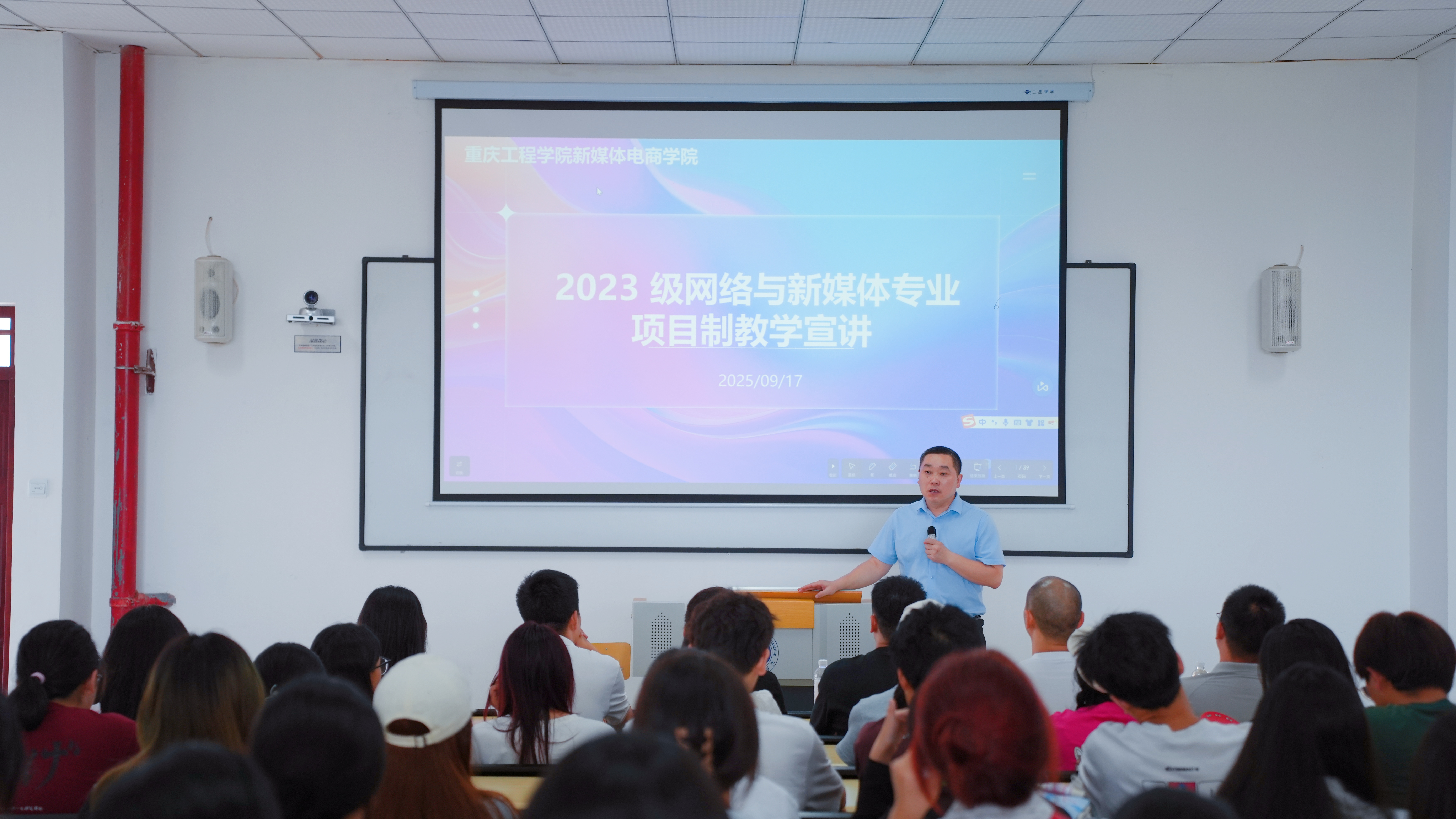 本网讯(文/图 新媒体系 张小玲)2025年9月17日下午,我院在6301报告厅召开“2023级网络与新媒体专业项目制教学”宣讲会。学院院长严伟、专业带头人张小玲、项目教学团队老师,以及火山引擎重庆实训基地教育规划师陈益、重庆巴渝歌行国际旅行社朱总,重庆夯豆电子商务有限公司洪总等企业代表出席,2023级全体网媒专业学生参会。