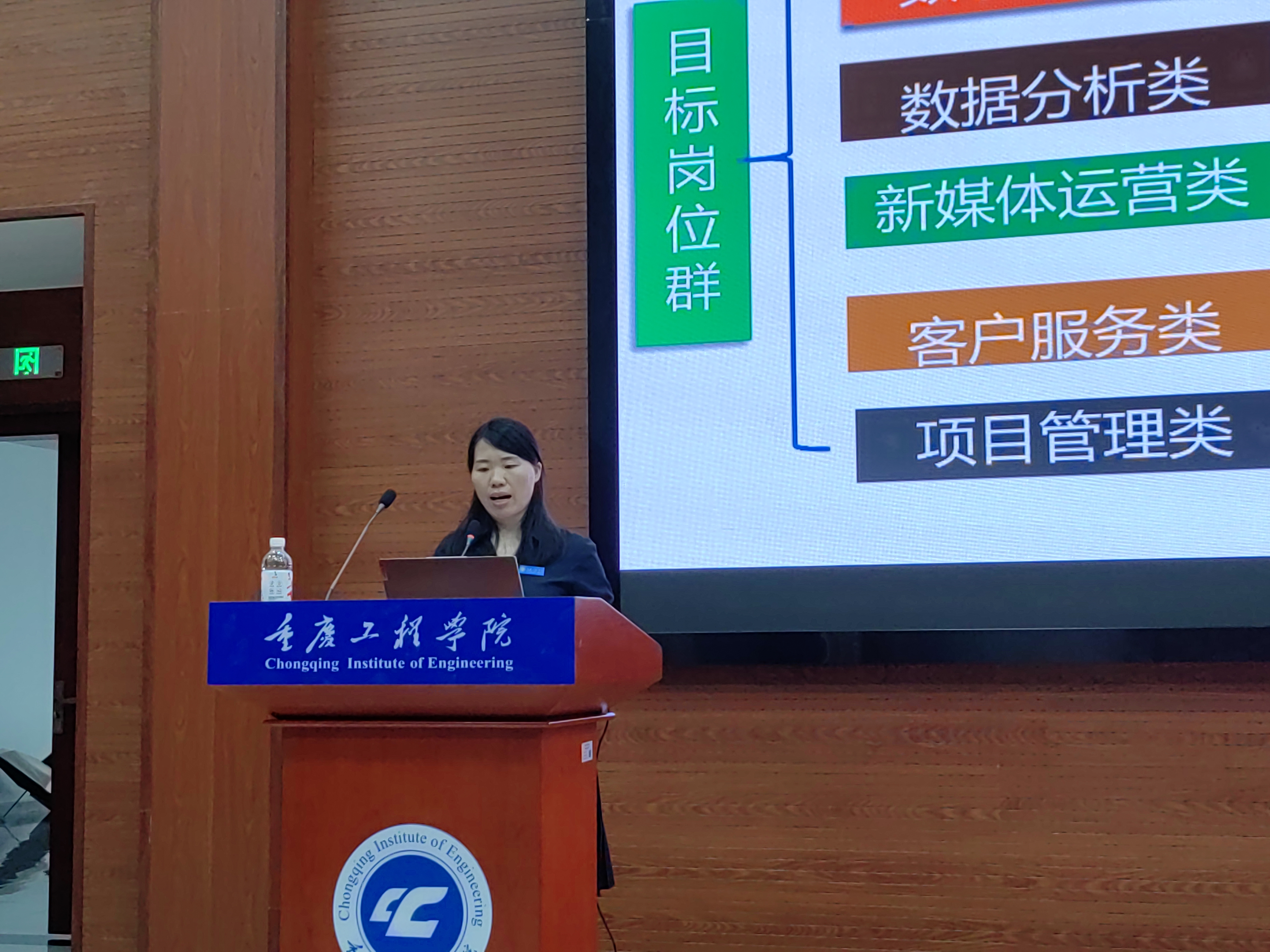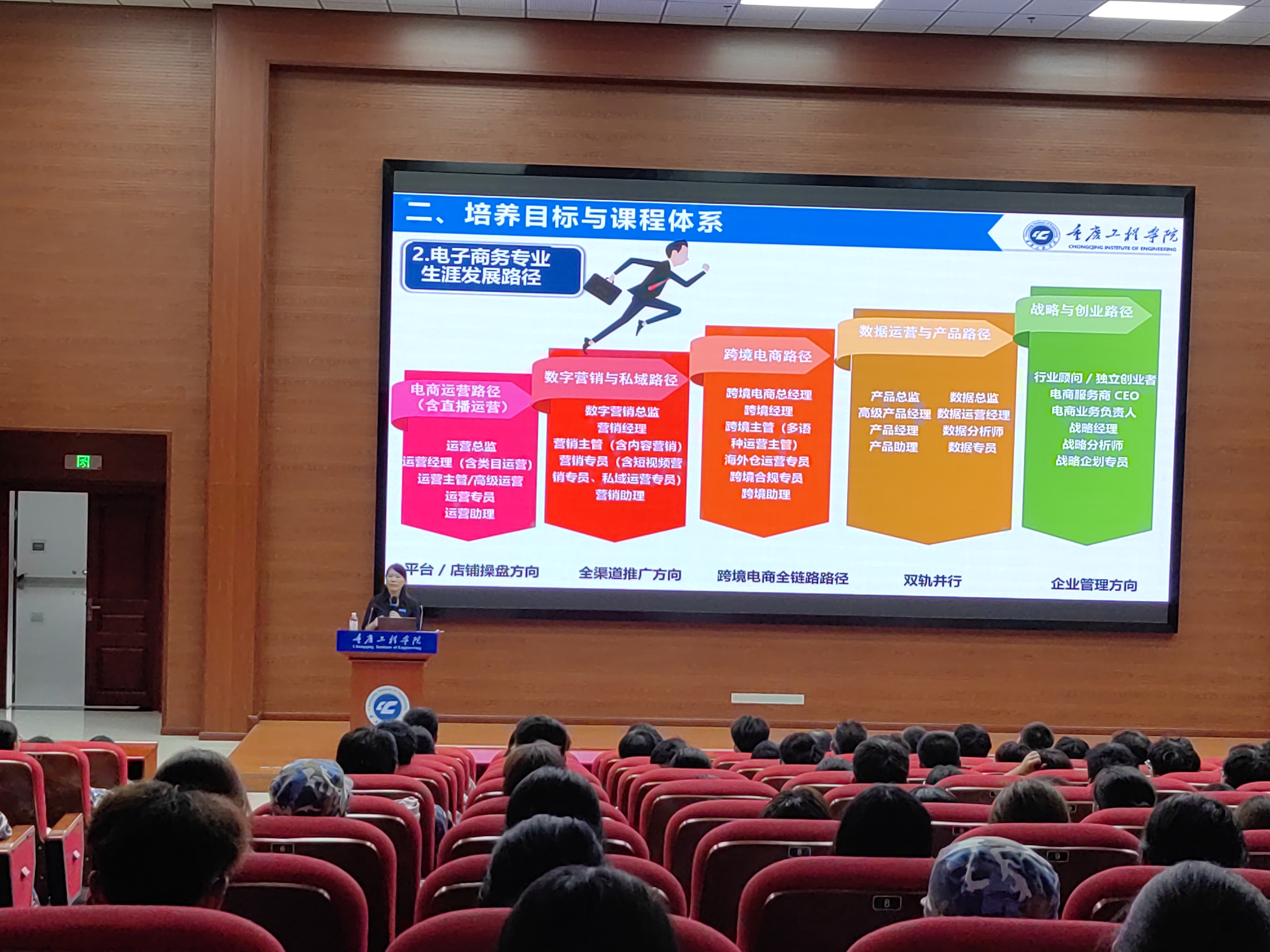随后,曹红梅聚焦电子商务专业本身,从四大关键板块展开介绍。在专业概述与专业发展部分,她梳理了电子商务专业的学科内涵、发展历程及行业趋势;在培养目标与课程体系部分,明确了专业的人才培养方向,详细解读了课程设置的逻辑与核心课程内容;在师资队伍与教学条件部分,展示了专业师资的学术背景、实践经验及学院配备的实训设施、校企合作资源;在职业发展与培养特色部分,分析了电子商务领域的就业方向、职业晋升路径,并强调了专业在实践教学、校企协同育人等方面的独特优势,为新生搭建起专业学习与未来职业发展的清晰桥梁。