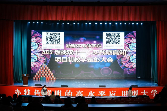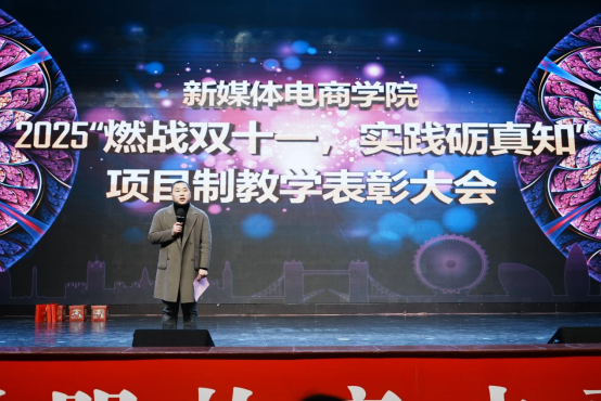 时维冬月,序属岁末。为全面总结“双十一”实战教学成果,表彰先进典型,凝聚奋进力量,2025年12月8日晚19时,新媒体电商学院“燃战双十一,实践砺真知”项目制教学表彰大会于学术报告厅隆重举行。学院院长严伟、院长助理宋超等领导出席大会,与全院师生齐聚一堂,共同见证实践育人的丰硕成果。
