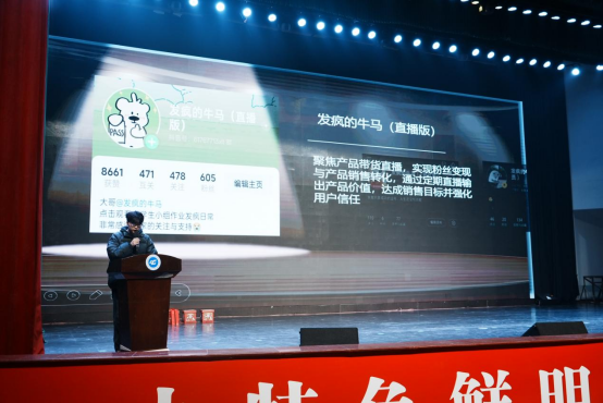 直播电商领域的表彰同样亮点纷呈。项目办主任杨青为向诗雨、冉欣怡等同学颁发“最佳主播奖”“最佳运营策划奖”等个人奖项。实训办主任燕霞为“鹿小井团队”“虾干团队”等授予“团队综合卓越奖”和“团队进阶飞跃奖”。优秀学生代表向诗雨生动讲述了直播实战的精彩故事。