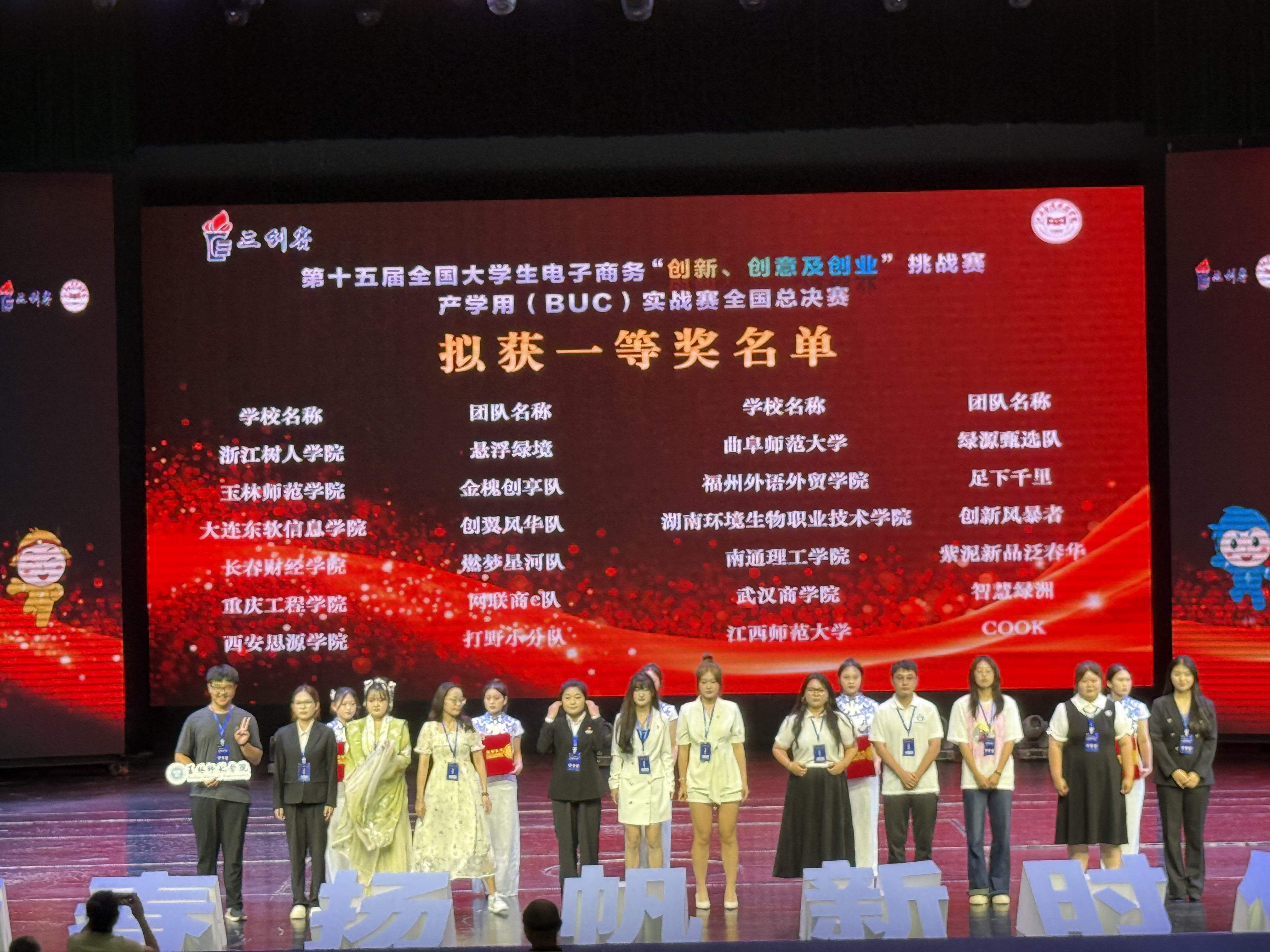 7月21日,第十五届全国大学生电子商务“创新、创意及创业”挑战赛产学用(BUC)实战赛全国总决赛在江西应用科技学院如期举行,新媒体电商学院参赛团队斩获佳绩!由王维冰老师带领的网联商e队,历经激烈角逐,凭借扎实的项目质量与出色的现场表现,在100多支队伍中脱颖而出,最终斩获一等奖,为学校再添荣誉!