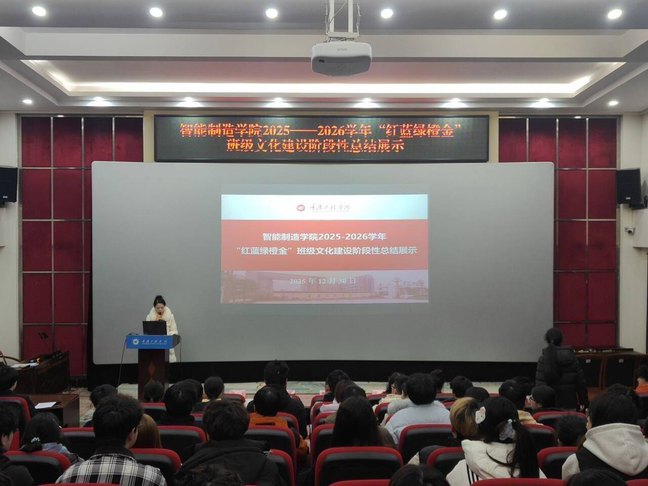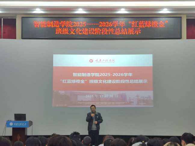 为深化“红蓝绿橙金”班级文化内涵建设,推进“五育并举”育人体系落地,强化学风建设与班级凝聚力,12月30日下午,智能制造学院在老办公楼报告厅举行2025-2026学年“红蓝绿橙金”班级文化建设阶段性总结展示大会,学院党总支书记刘达斌、全体辅导员及2023级、2024级各班班委参会。