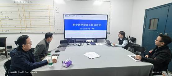 (图/文 数字孪生产业学院 周清玲)为全面掌握教学运行状况,持续提升教育教学质量,我院于11月12日在7104正式启动2025-2026学年第一学期期中教学检查工作。本次检查工作部署会,由学院助理刘阳主持,系主任石磊,教研组组长陈世林、胡中英,研究所副所长任然,以及教务秘书周清玲参会。