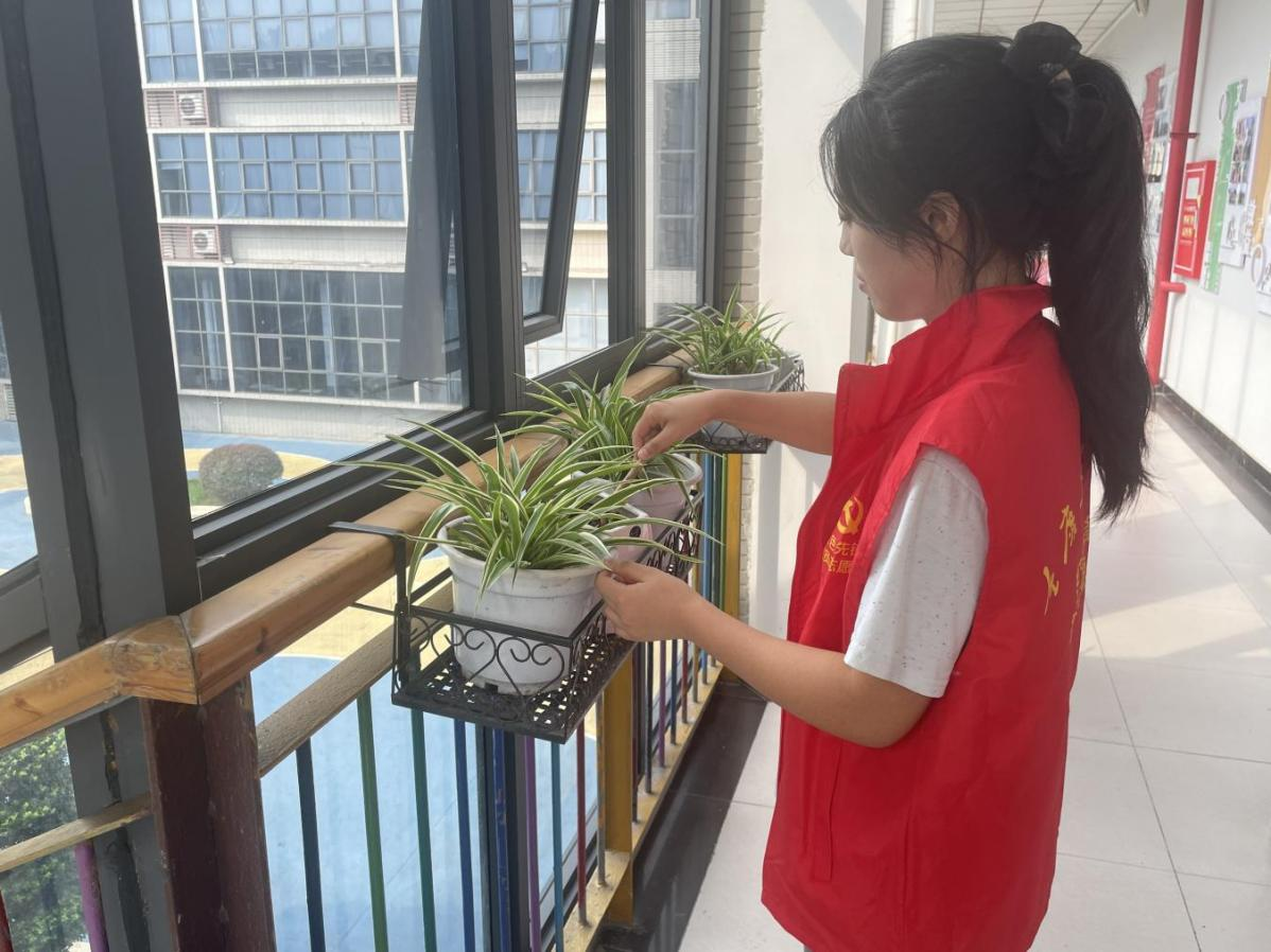 活动伊始,多名师生党员热情高涨,纷纷身着醒目的红马甲投入到工作中。经过两个小时的不懈努力,原本分散的盆栽在第五教学楼每层走廊有序排列,形成了一条独特的“空中花带”,为开学季的校园增添了一抹充满生机的盎然新绿。原本略显单调的教学楼,在这些绿植的点缀下,面貌焕然一新。