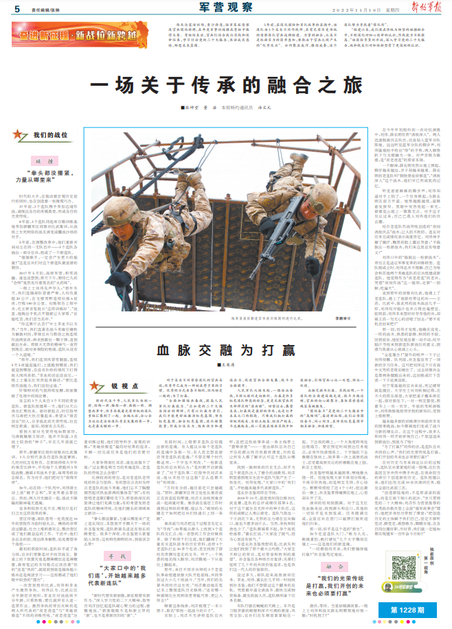 找到一脉相承的历史支点,似乎为这个新连队注入了磨合的润滑剂,刘洋明显感到现实生活中连队气氛产生了一些变化。刘伟发现,“大家口中的‘我们连’,开始越来越多代表新连队。”